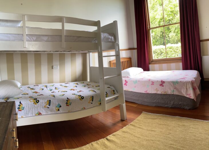 The master bedroom includes a super-king bed and private en-suite. The ground floor also includes two additional bedrooms-one furnished with a queen bed, and the other with both a set of bunks and king single.